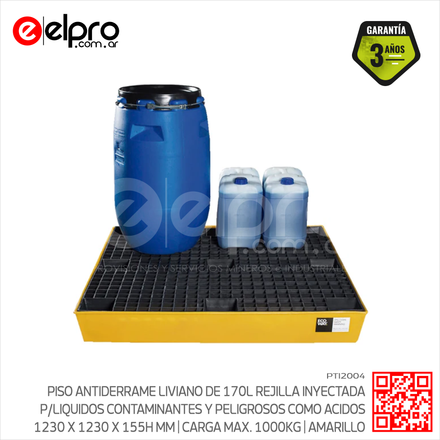 - También calza 4 tambores de 200 Lts. y en ese caso provee una contención parcial. Dado que es una contención parcial, se recomienda que se use el PTI2004 únicamente para trabajar con los tambores, no para almacenarlos.