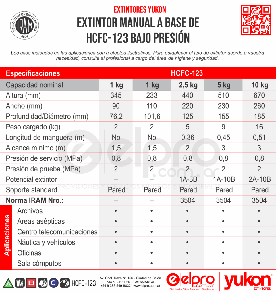 - HCFC 123 (reemplazante ecológico del Halón 1211), para fuegos clase ABC.